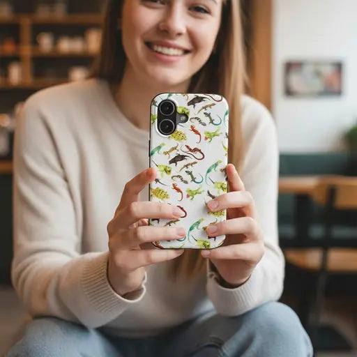 Our Lizards phone case features a dual-layer shock-absorbing TPU core wrapped in a tough polycarbonate shell. A UV-resistant coating keeps that signature Lizard print vibrant and prevents yellowing for lasting style.